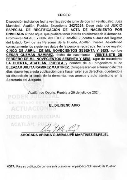 EDICTO A TODO INTERESADO. Disposición judicial del cuatro de julio del dos mil veinticuatro, Juez Civil Municipal de Acatlán, Puebla, expediente 268/2024, déseles vista a todas aquellas personas que pudieran tener interés en contradecir Demanda de Rectificación de Acta de Nacimiento, promueve ENRIQUE ARNULFO ASUNCION VAQUERO, contra Juez del Registro Civil de AHUEHUETITLA, PUEBLA, asiéntese único mis datos correctos; MI NOBRE: ENRIQUE ARNULFO ASUNCION VAQUERO MARTINEZ, FECHA DE NACIMIENTO: DIECIOCHO DE JULIO DE MIL NOVECIENTOS CUARENTA Y CINCO, LUGR DE NACIMIENTO: PIEDRA BLANCA AHUEHUETITLA, PUEBLA, NOMBRE DE LOS PAPAS; INCENCIO VAQUERO ARIZA, AURELIA MARTINEZ CALIXTO, en los espacios correspondientes del LIBRO NO° 01 DE NACIMIENTOS DEL AÑO 1945, en el ACTA Nº 38, DE FECHA DE REGISTRO QUINCE DE AGOSTO DE MIL NOVECIENTOS CUARENTA Y CINCO, del Juzgado del Registro del Estado Civil de las Personas de Ahuehuetitla, Puebla, producir contestación tres días siguientes a su publicación, apercibimientos legales, copias, traslado y auto admisorio a su disposición en Secretaria Civil del Juzgado. Acatlán, Puebla, a veintinueve de julio del dos mil veinticuatro. C. DILIGENCIARIA. ABOGADA ARIANA GUADALUPE MARTINEZ ESPEJEL