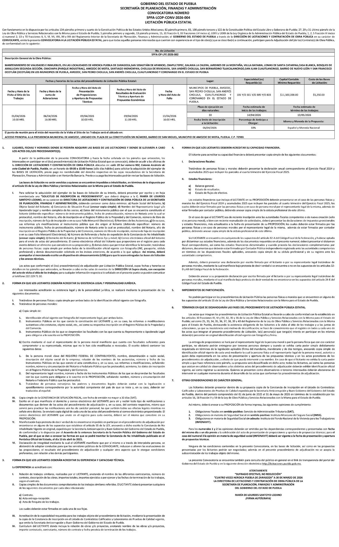 La Secretaría de Planeación, Finanzas y Administración del Gobierno del Estado de Puebla, a través de la Dirección de Adquisiciones de Bienes y Servicios, en observancia del artículo 134 de la Constitución Política de los Estados Unidos Mexicanos, artículo 108 de la Constitución Política del Estado Libre y Soberano de Puebla; así como los artículos 15 fracción I, 16, 78, 79, 82 segundo párrafo,108 y demás que resulten aplicables de la Ley de Adquisiciones, Arrendamientos y Servicios del Sector Público Estatal y Municipal; artículo 47 de la Ley de Egresos del Estado de Puebla para el ejercicio fiscal 2026, 33 fracción LXXV de la Ley Orgánica de la Administración Pública del Estado de Puebla; y artículos 5 fracción VI, inciso c), 9, 13 fracción III y 68 fracciones II y III del Reglamento Interior de la Secretaría de Planeación, Finanzas y Administración del Gobierno del Estado de Puebla, convoca a los interesados a presentar libremente propuestas solventes en idioma español en sobre cerrado, a las personas físicas o morales, de nacionalidad mexicana, en las licitaciones públicas, cuyas bases contienen los requisitos de participación. Los interesados podrán revisar las bases previamente a su pago, el cual será requisito para participar en las licitaciones, en www.licitaciones.puebla.gob.mx y en la Dirección de Adquisiciones de Bienes y Servicios, en el tiempo establecido en los procedimientos.
