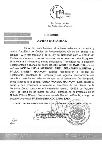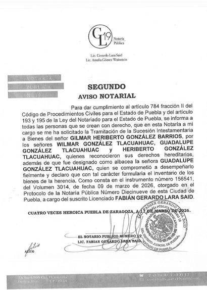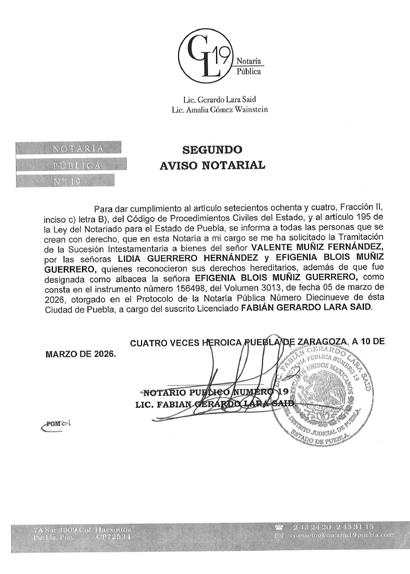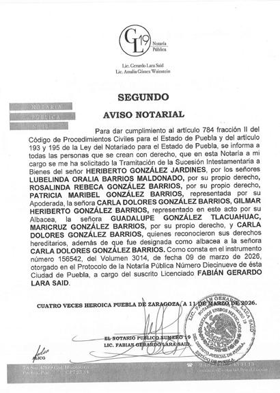 C).- LOS DERECHOS HEREDITARIOS DE ESTA SUCESIÓN A FAVOR DE LOS ANTES MENCIONADOS. D).- LA DESIGNACIÓN DE ALBACEA QUE RECAYÓ EN EL SEÑOR VÍCTOR MANUEL DEL VILLAR LLEDIAS, POR DESIGNACIÓN DE TODOS LOS HEREDEROS Y EN ATENCIÓN A QUE LA ALBACEA INSTITUIDA FALLECIÓ ANTES QUE EL AUTOR DE LA HERENCIA. E).- QUE EN SU OPORTUNIDAD EL ALBACEA, PROCEDERÁ A FORMULAR EL INVENTARIO DE LOS BIENES DE LA HERENCIA. ATENTAMENTE SUFRAGIO EFECTIVO NO REELECCIÓN. TEHUACÁN, PUEBLA, A 17 DE MARZO DE 2026 TITULAR DE LA NOTARIA PÚBLICA NUMERO SIETE. LIC. JOSÉ LUIS SALGADO VÁZQUEZ. Para su publicación por dos veces en un término de diez días en el Periódico “El Heraldo de Puebla”.