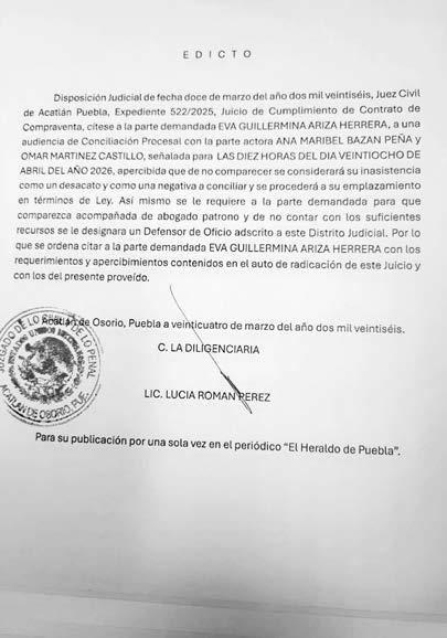 DISPOSICIÓN: Juzgado Municipal de Mixtla, Puebla. Por auto de fecha veintinueve de enero de dos mil veintiséis, se radica el expediente 08/2026, dictado en el Juicio de Rectificación de Acta de Nacimiento por Enmienda, promovido por MARÍA DOLORES RAMOS ROSAS en contra del Juez del Registro del Estado Civil de las personas de Los Reyes de Juárez, Puebla, se pretende rectificar lugar de nacimiento de la representada y se lee: EN SU CASA HABITACIÓN, debiendo ser lo correcto: LA CONCORDIA DE AQUILES SERDÁN, LOS REYES DE JUÁREZ PUEBLA, PUEBLA; nombre de los progenitores del representado y se lee: GERMIN RAMOS MARTÍNEZ y ANA ROSAS CAMACHO, debiendo ser lo correcto: FERMÍN RAMOS MARTÍNEZ y ANA MARÍA ROSAS CAMACHO. POR MEDIO DEL PRESENTE EDICTO EN CUMPLIMIENTO AL PUNTO TERCERO DEL ACUERDO YA MENCIONADO, CONVOCO A TODO AQUEL QUE SE CREA CON DERECHO DE CONTRADECIR LA PRESENTE DEMANDA, A FIN DE QUE DENTRO DEL TERMINO DE TRES DÍAS POSTERIORES A LA PUBLICACIÓN CONTESTEN LA DEMANDA Y SEÑALEN DOMICILIO EN LA SEDE DE ESTE JUZGADO PARA RECIBIR SUS NOTIFICACIONES AUN