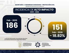 De acuerdo con cifras del Secretariado Ejecutivo del Sistema Nacional de Seguridad Pública, en febrero de 2025 se registraron 186 delitos, mientras que en el mismo mes de 2026 la cifra disminuyó a 151. Este resultado refleja el compromiso de la actual administración por fortalecer la seguridad y la tranquilidad de las familias.
