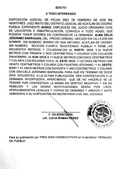 DISPOSICION JUDICIAL. Juez Civil Acatlán, Puebla, se convoca toda personal se crea con derecho a la herencia, expediente 5/2023, Juicio Sucesorio Intestamentario, a bienes de ROSALIO REYES RIOS y/o ROSALIO REYES y/o ROSALIO REYES R y/o ROSALIO REYES E originario y vecino del Municipio de San Miguel Ixtlan, Puebla, promueve MARINA VALDIVIA MORALES y/o MARINA VALDIVIA y/o MARIA VALDIVIA y/o MARINA VALDIVIA M y/o MARINA VALDIVIA DE R. y/o MARINA VALDIVIA M. DE V y LORENA YANET, RUTH, CESAR, HUGO MORONI, ROSALIO, MARTHA, ORTENCIA, OCTAVIO, EFIGENIA Y TEODORO todos de apellidos REYES VALDIVIA, por su propio derecho, comparezca termino diez días, a partir día hábil siguiente a esta publicación. Quedando a su disposición en Secretearía, copia de la demanda, sus anexos y del auto admisorio. Acatlán de Osorio, Puebla, a dieciocho de abril del año dos mil veintitrés. LA DILIGENCIARIA ABOGADA LUCIA ROMAR REREZ. NOTA: Para su publicación por una sola vez en el periódico “El Heraldo de Puebla”