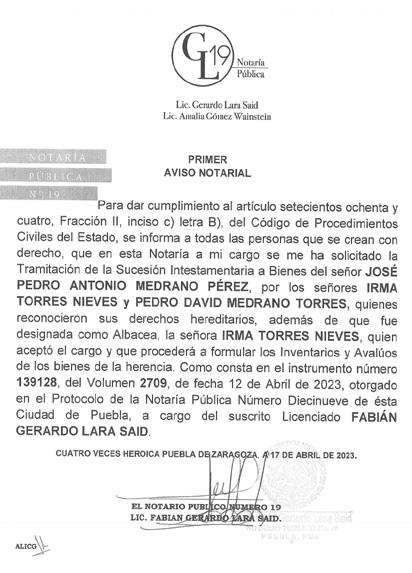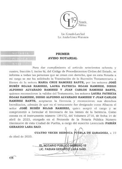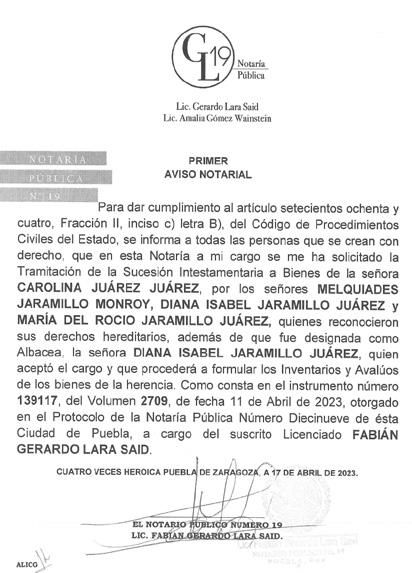 LA DILIGENCIARIA ABOGADA LUCIA ROMAN PEREZ. NOTA: Para su publicación por una sola vez en el periódico “El Heraldo de Puebla