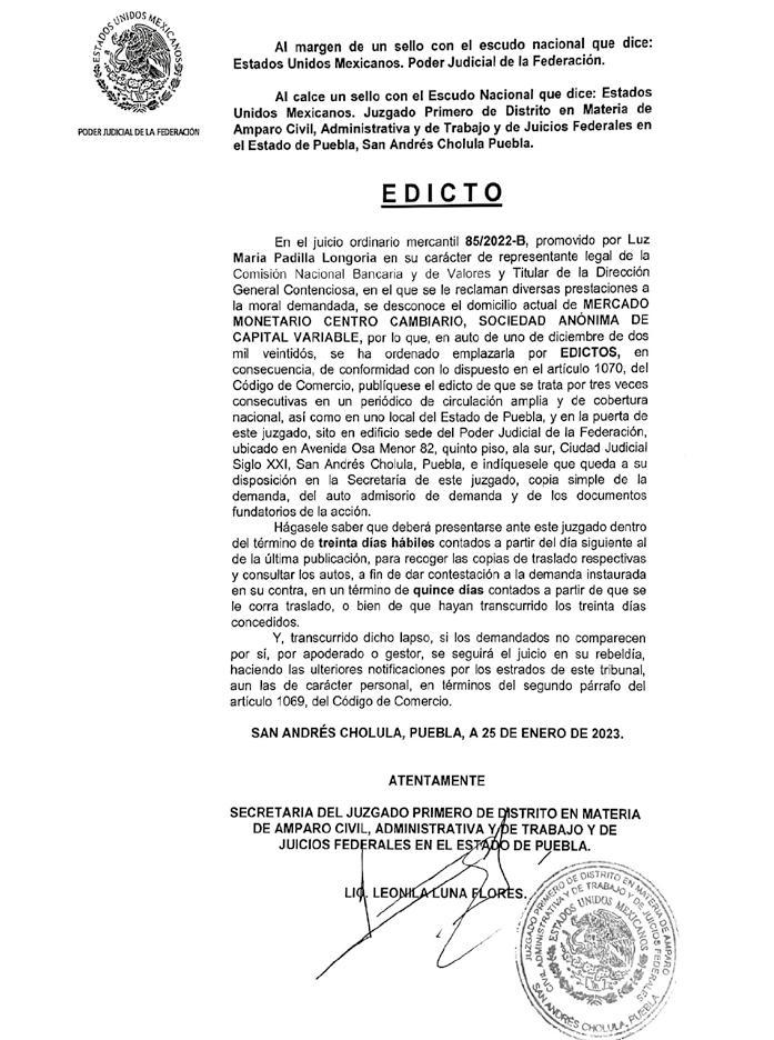 Al margen sello con Escudo Nacional dice: Estados Unidos Mexicanos, Juez de lo Civil del municipio de Acatlán de Osorio, Puebla. Juez Civil del municipio de Acatlán de Osorio, Puebla. El tres de abril de dos mil veintitrés, en expediente 97/2023, Juicio Rectificación de Acta de Nacimiento, actora ARIADNA GUADALUPE MARTÍNEZ VILLA, a través de su madre JUANA ISABEL VILLA CARIÑO, se ordena emplazar a toda persona que tenga interés en contradecir demanda consistente en: 1) lugar de nacimiento incorrecto, al correcto que es ACATLÁN DE OSORIO, ACATLÁN, PUEBLA, y 2) nombre propio que se encuentra alterado o encimado, al correcto que es ARIADNA GUADALUPE MARTÍNEZ VILLA. Se concede término de tres días posteriores a ésta publicación. Copias de traslado y acuerdo, en Secretaría del Juzgado. Acatlán de Osorio, Puebla; a tres de abril de dos mil veintitrés. El Diligenciario. Lic. Ernesto Jiménez Santiago. Nota: para su publicación por único día en el periódico “Heraldo”.