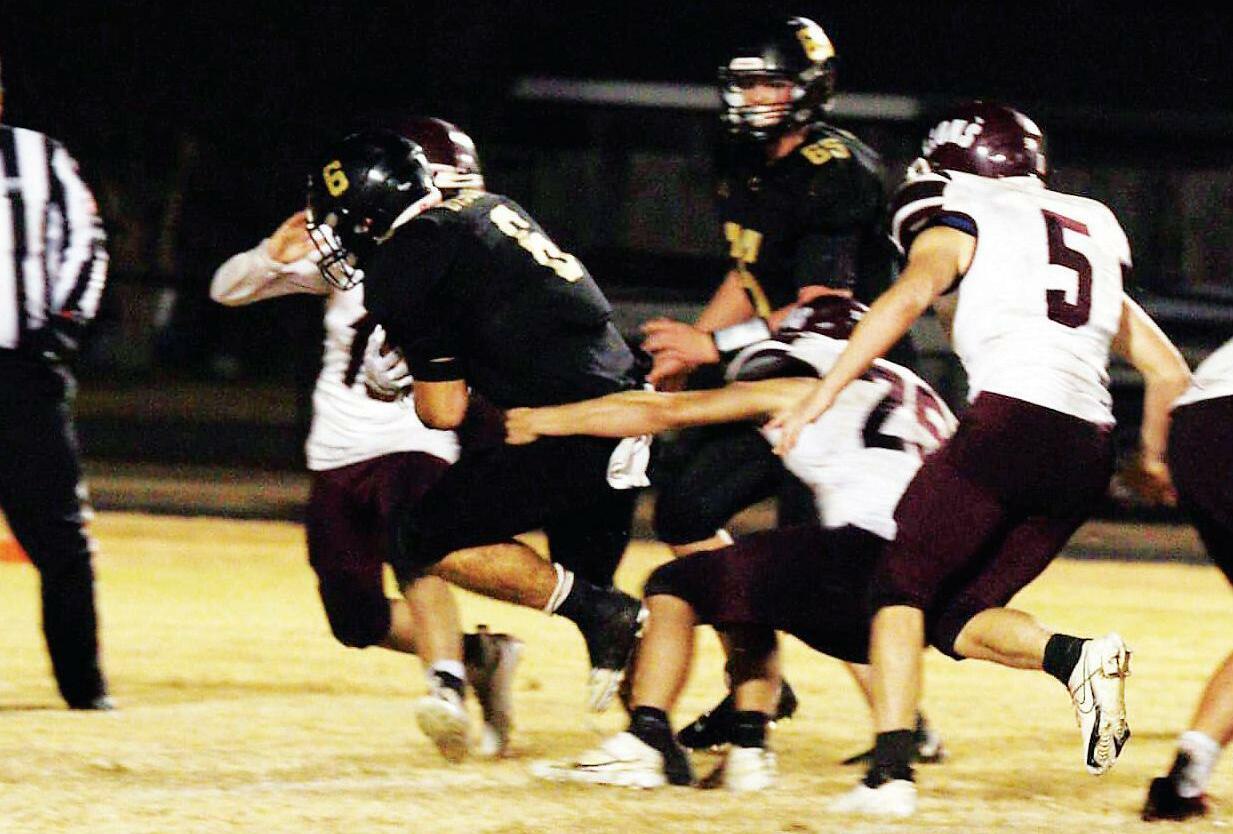Carlisle’s Jason Sullivan drags tacklers with him during the Bison’s win over Mount Ida on Friday night.