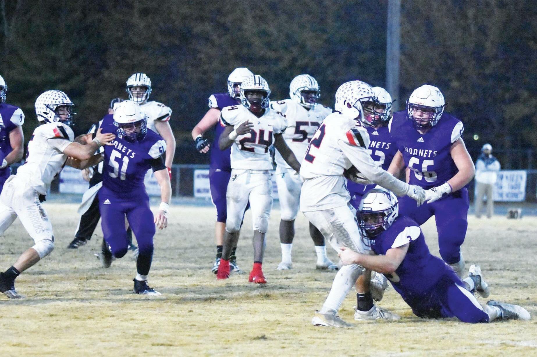 The Hornet defense held the EPC Warriors to 16 points in the 2A semifinals on Friday night. (Ruth Corley photos.)