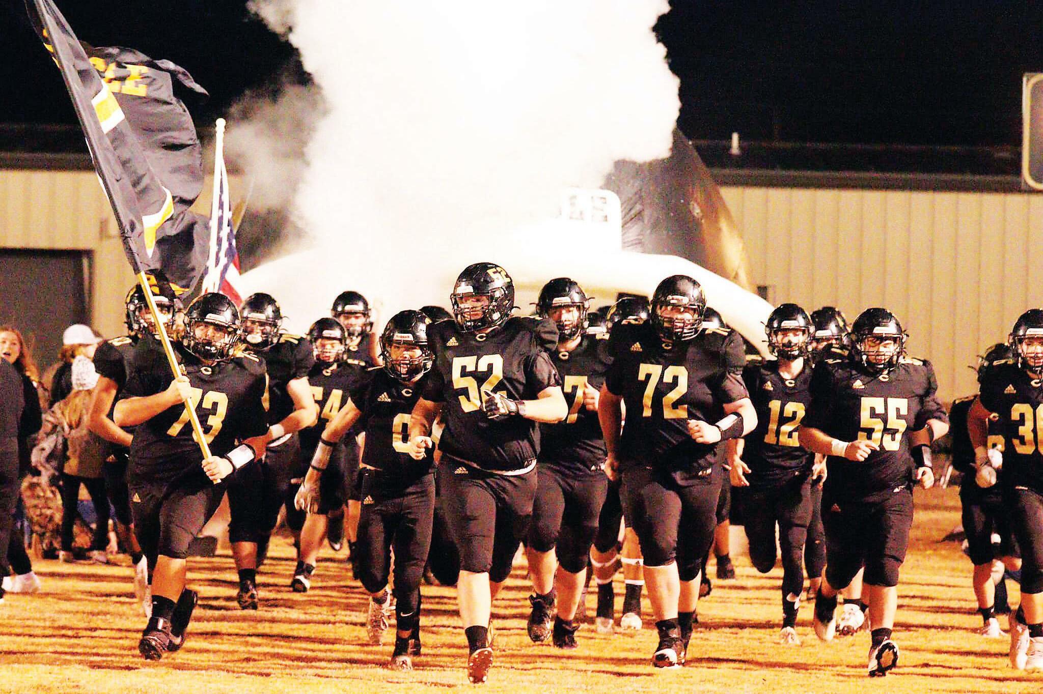 The Carlisle Bison enter the playing field at Fred C. Hardke Field prior to the start of the semifinals against Mount Ida on Friday night. (Brenda Foster photos.)