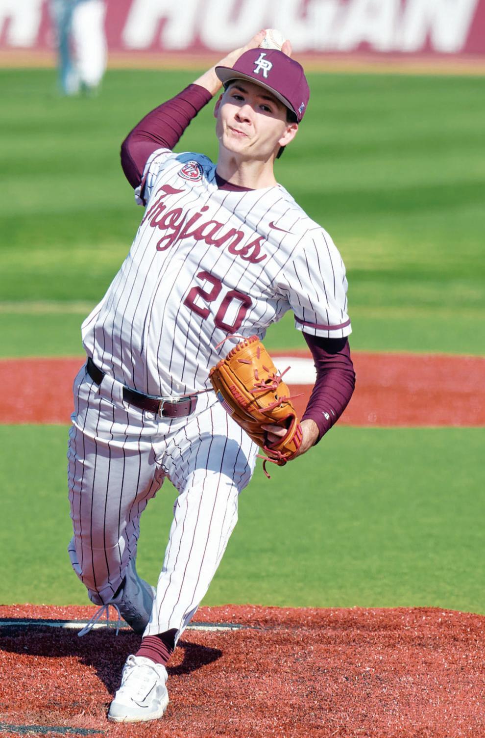 Former Carlisle Bison pitcher Zach Busick, throwing for the Little Rock Trojans, helped his team beat No. 11 Ole Miss on Tuesday, April. 15, in Oxford, Miss. (Mark Wagner photo)