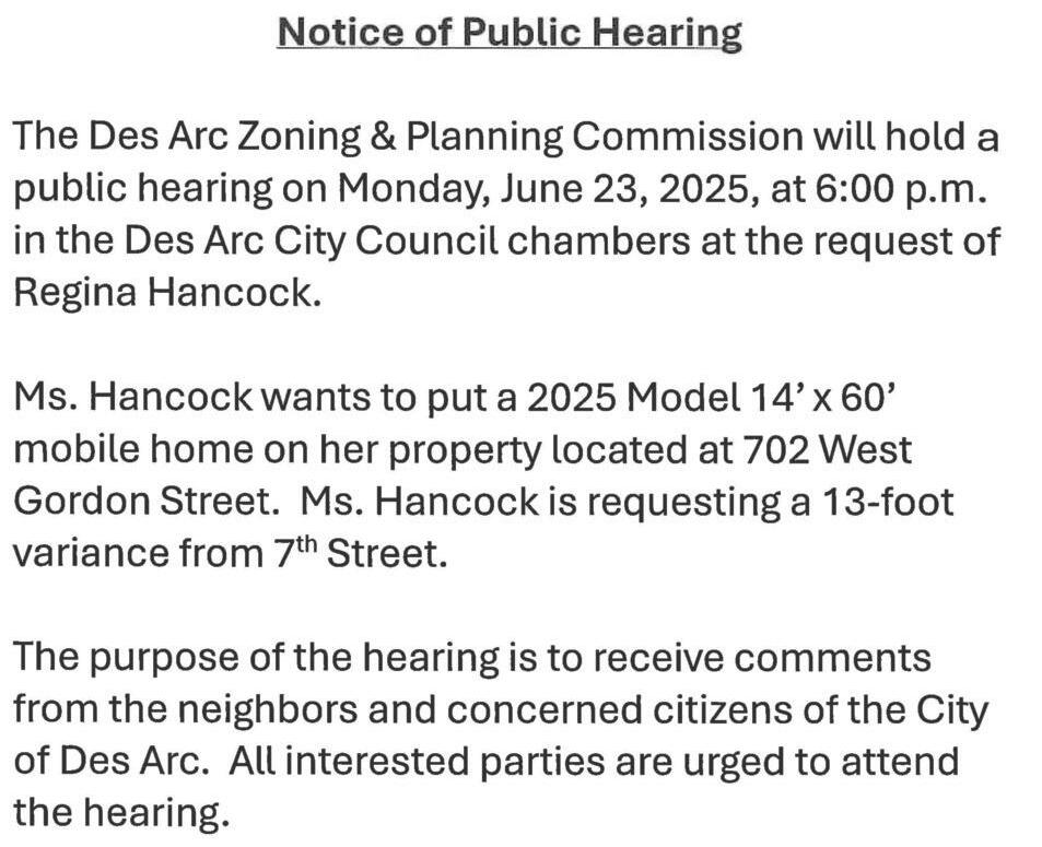 The City of Des Arc is currently seeking a Code Enforcement Officer. The part-time Code Enforcement Officer is responsible for the enforcement and compliance of City Code and Zoning laws. The officer performs a variety of technical duties including but not limited to: conducting field inspections to identify violations, responding to complaints, removing illegal signs, and working with those non-compliant properties/busi-