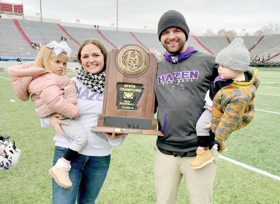 New Carlisle assistant football coach BJ Harrison is pictured with his wife Chelsey and children Maeve and Bishop following Hazen’s win over Carlisle in the 2022 Class 2A state title game at War Memorial Stadium in Little Rock.
