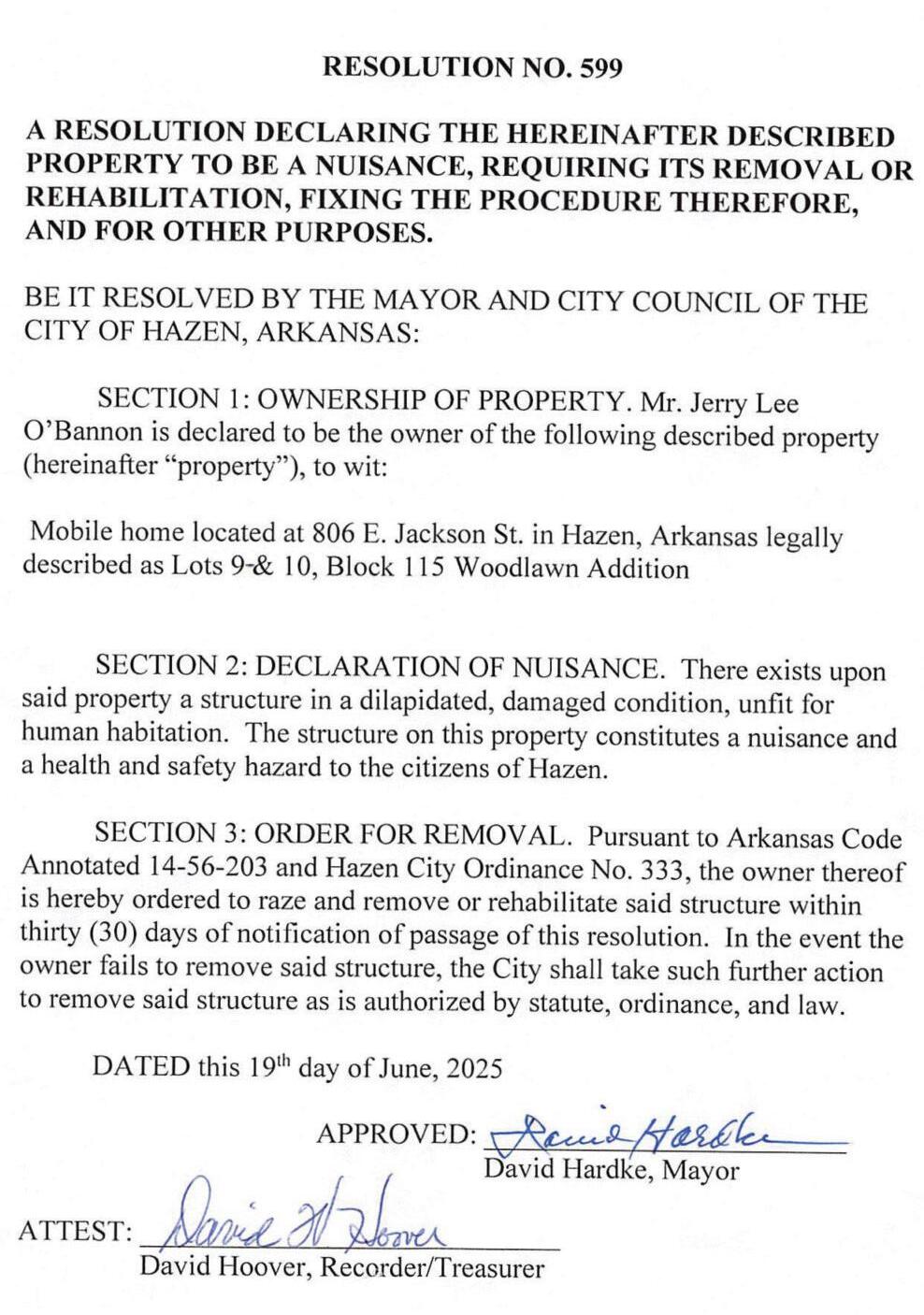 Mayor David Hardke gave an update on the condemnation of the Donnie Forrester property on East Jefferson St. The city has only been able to contact one of the present owners, and the city has to wait 30 days now that the owner has received the condemnation notice. The council also passed a resolution to condemn another property in town located at 806 East Jackson. The con-