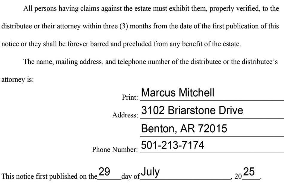 TO: Berry Eddie Valdez or Anyone having claim in the above property. You are hereby notified that The Micheal and Melissa Barre Living Trust Plaintiff, whose attorney is Christopher D. Brockett, Robertson, Beasley, Shipley & Robinson, has filed a Petition to Quiet Title against Berry Eddie Valdez and their Heirs, a copy of which Petition to Quiet Title shall be delivered to you or to your attorney upon request.