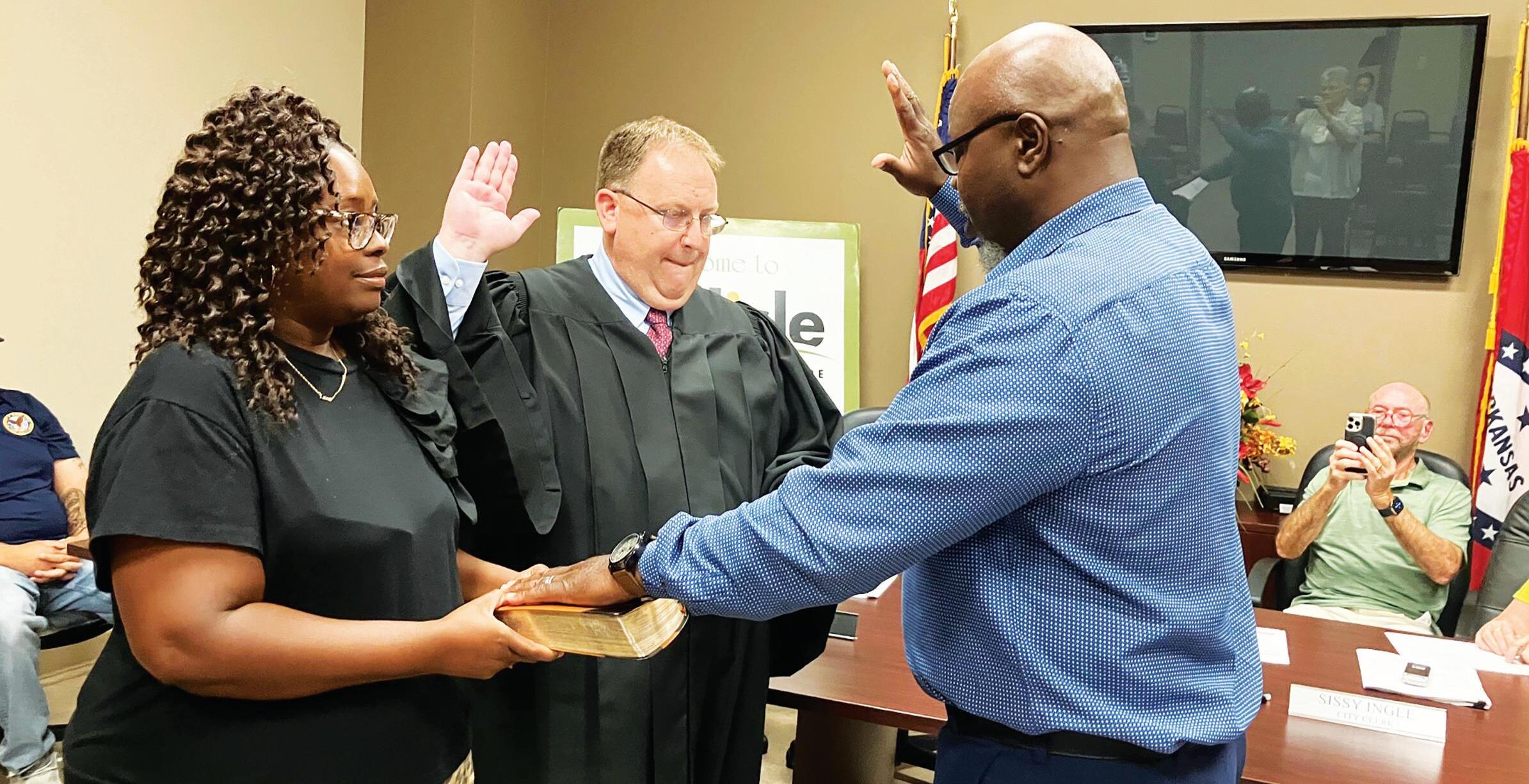 Farris McClain is the newest member of the Carlisle City Council. He was sworn in by Judge Ashley Parker, and Shatonda McClain held the Bible.