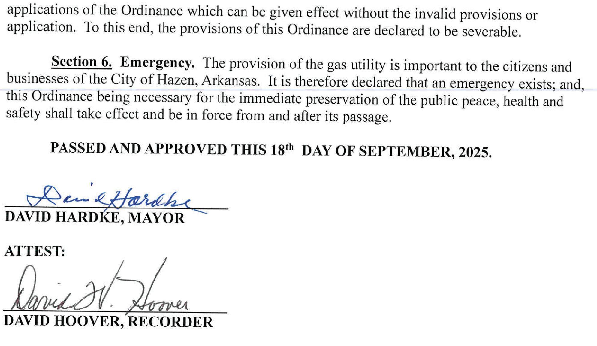 The Hazen City Council met on September 18, 2025, to pass an ordinance to amend the Hazen Municipal Code for gas rates. Present at the meeting were Council Members Larry Anthony, Barbara Rogers, Tim Juola, and Steve Chlapecka in addition to Mayor David Hardke and Recorder/Treasurer David Hoover. Ordinance 527 raises the gas price after the first 500 cubic feet used by a customer by fifty cents from $5.00 per 1000 cubic feet to $5.50 per 1000 cubic feet. The minimum charge will remain $15.00 per month for the first 500 cubic feet, and the minimum charge per month will remain $15.00. The wheeling charge for DeValls Bluff and Biscoe will remain at $1.20 per 1000 cubic feet. The new rate will increase charges for city customers by five to six percent.
