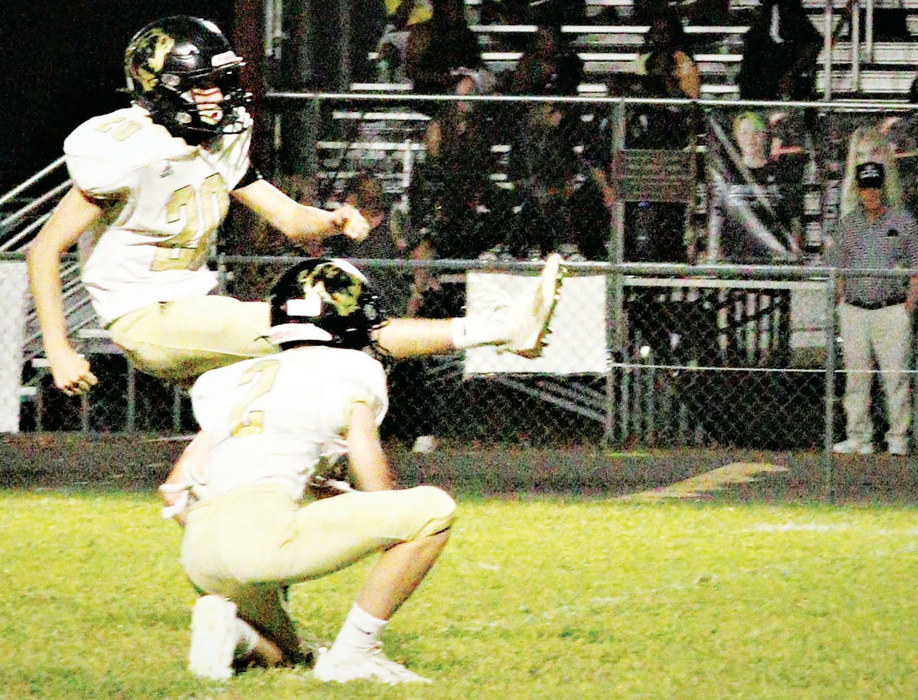Hornet blockers clear the way for Number 10 to sweep around the end of the line. (Ruth Corley photo.) Carlisle kicker Peyton Huggins kicks an extra point against Bearden on Friday night. Also pictured is holder Preston Parker. Huggins was 6 for 6 against Bearden.