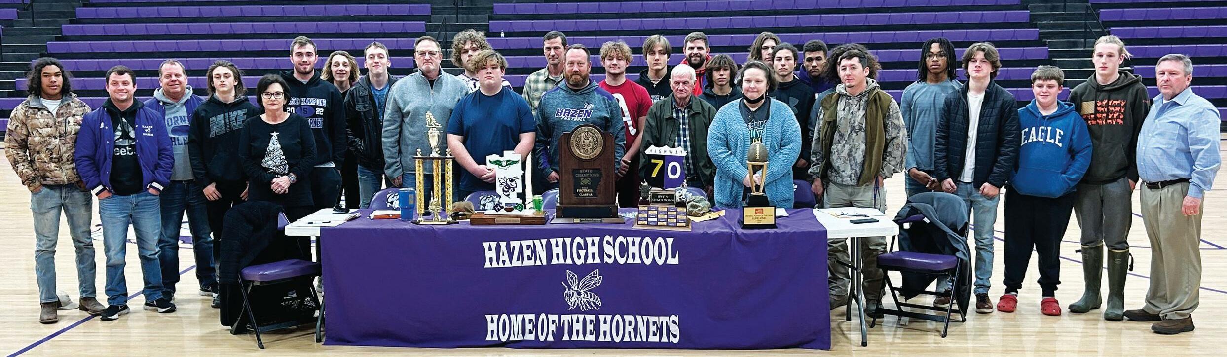 The Hazen Hornet football team and coaches presented their trophies to the Superintendent Donnie Boothe and the Hazen School Board. The trophies will be on display in the high school. (Summer Greenwalt picture.)