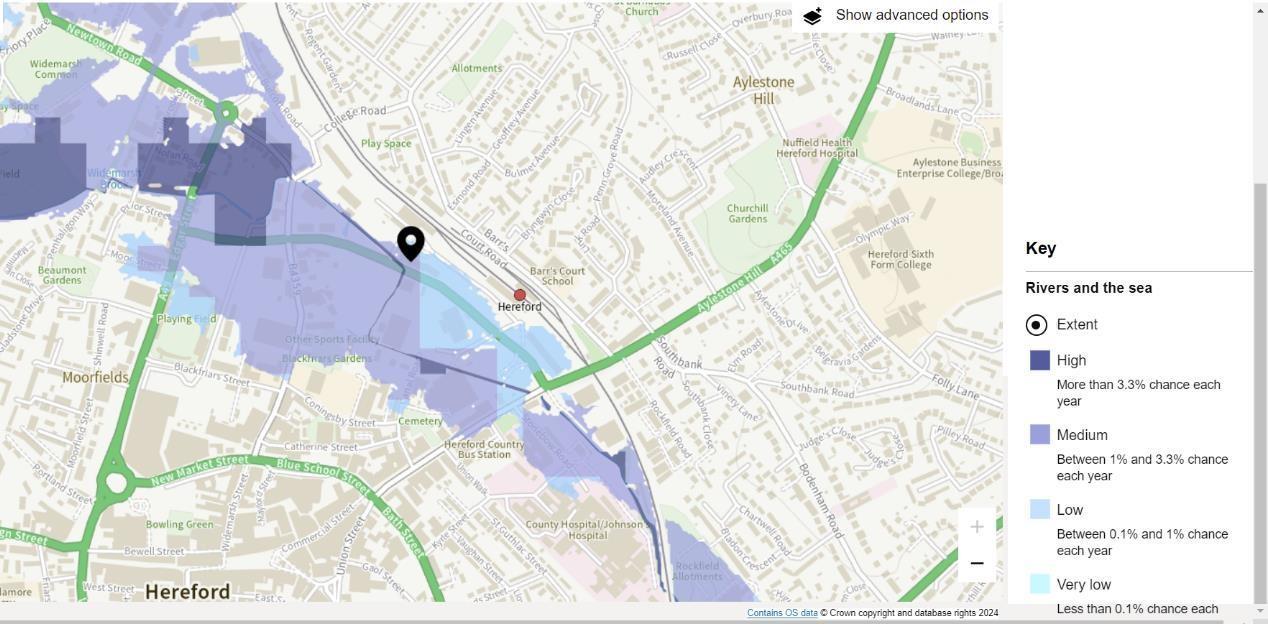 Map from Government website showing largest areas with highest flood risk are at Westfields, Merton Meadow and Essex Arms site.