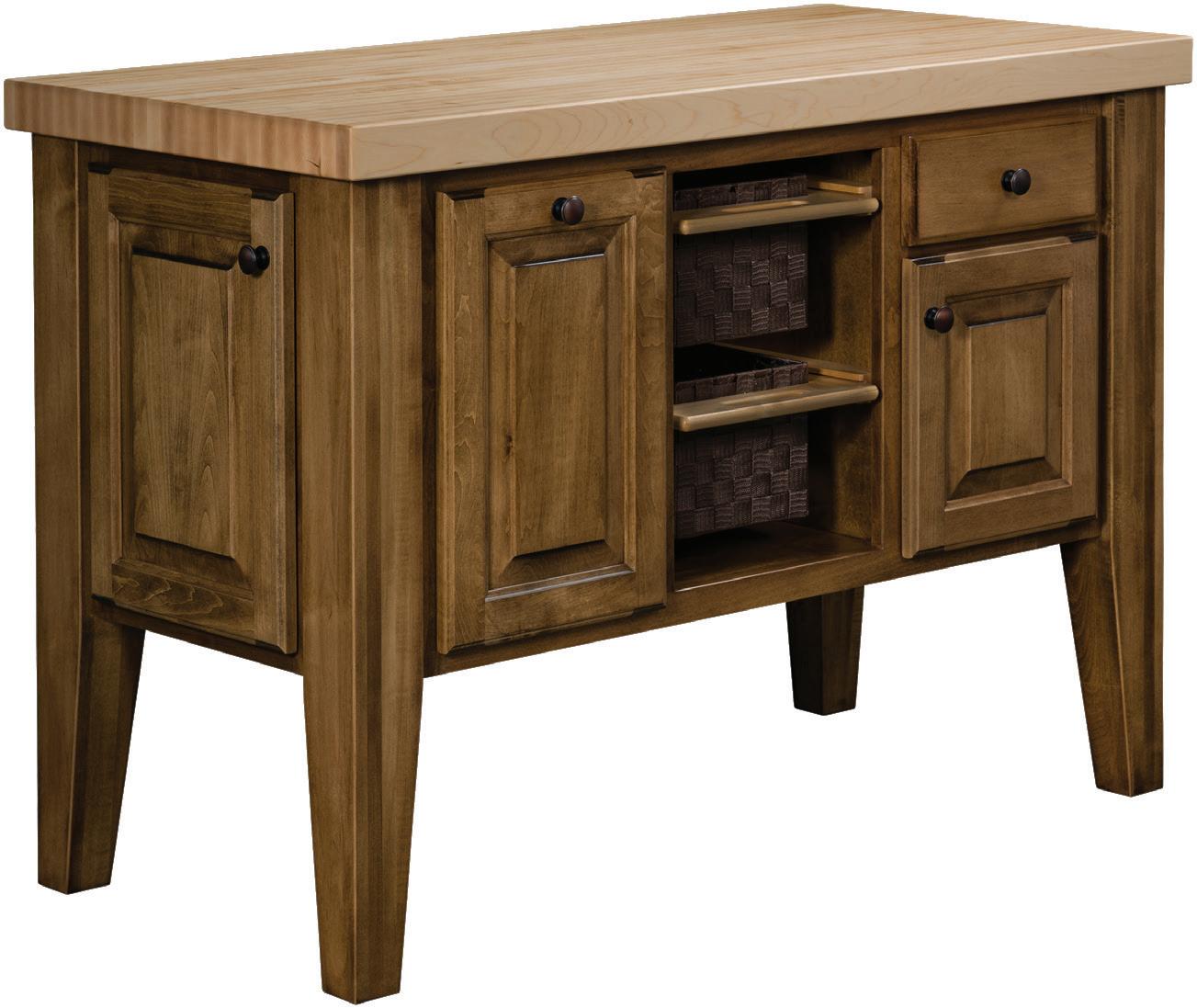 Versatile butcher block topped island featuring open shelves and enclosed storage.