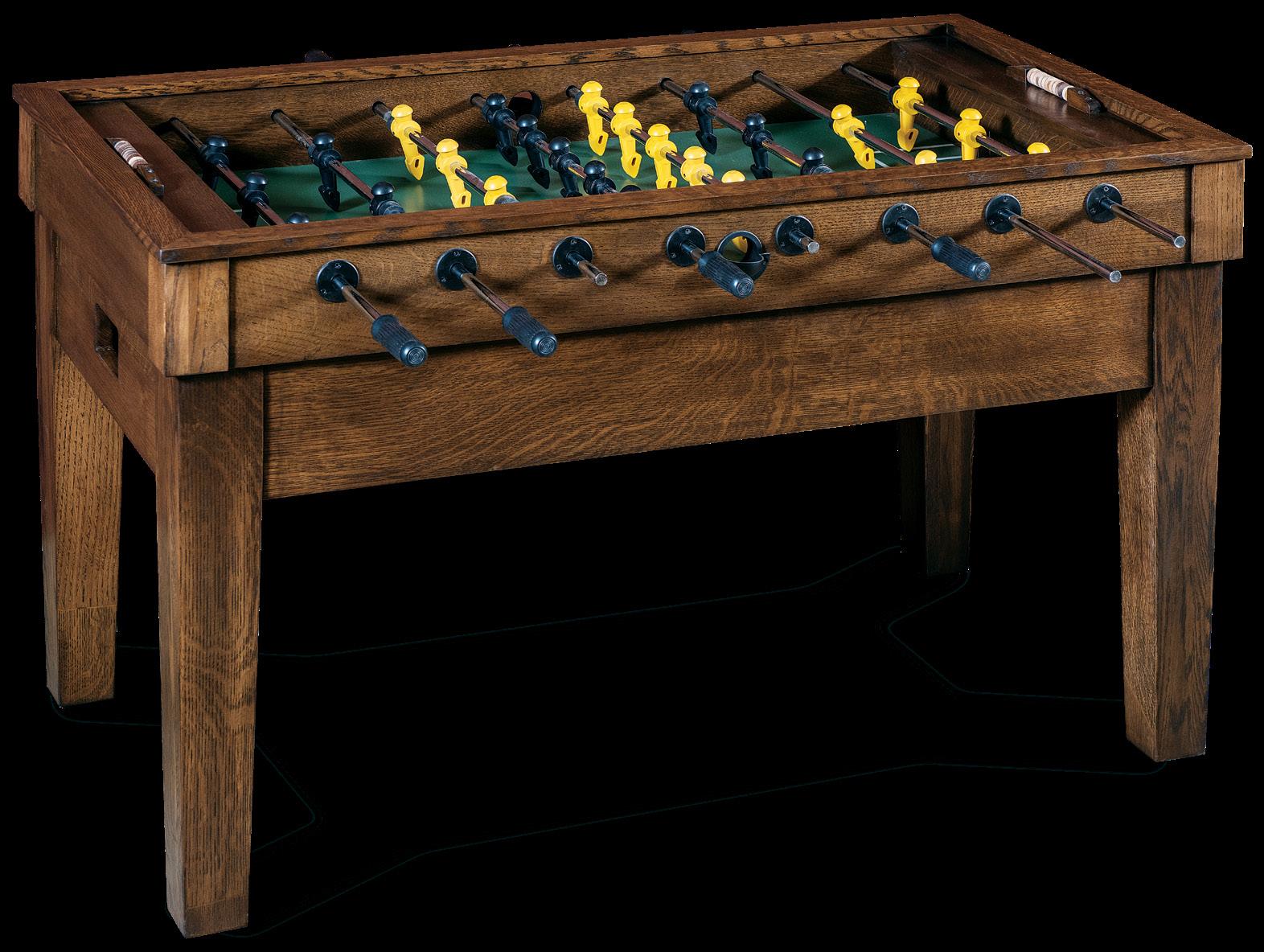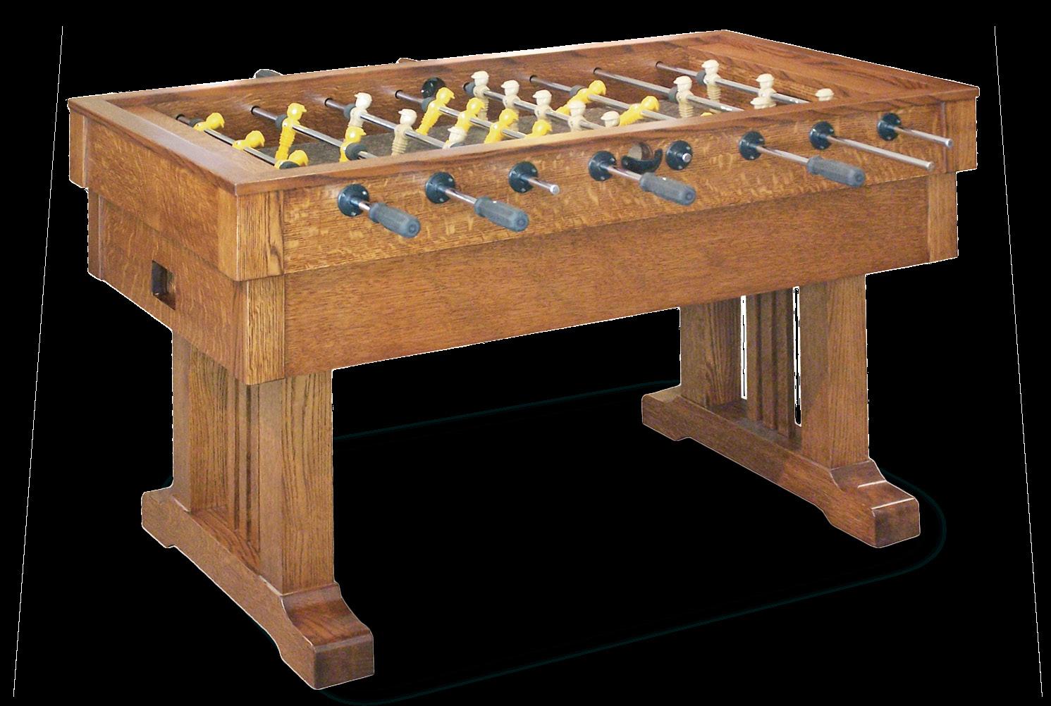This is the ultimate quality foosball table. Solid Quartersawn White Oak 1.5" thick cabinet and a laminate playing surface. Solid chromed steel rods, tournament style men and soft rubber handles. The table measures 30" x 56" x 34"h. The playing table lifts off for easy transport and future game add-ons. A centerless ground foosball is included. The legs are 3.5"x 3.5" solid hardwood. Available in most wood species. This is a solid and heavy table that will take a lot of excited Fooser abuse, but still fits in with any game room décor.