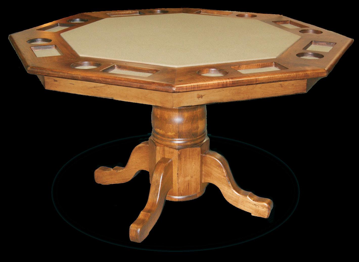 A round game table with a round leather or cloth insert for the playing surface, curved chip areas, and a traditional pedestal. Available as standard or flip top. Available in Oak, Brown Maple, Quartersawn White Oak, Cherry, Hickory or Walnut. Other pedestal options available.