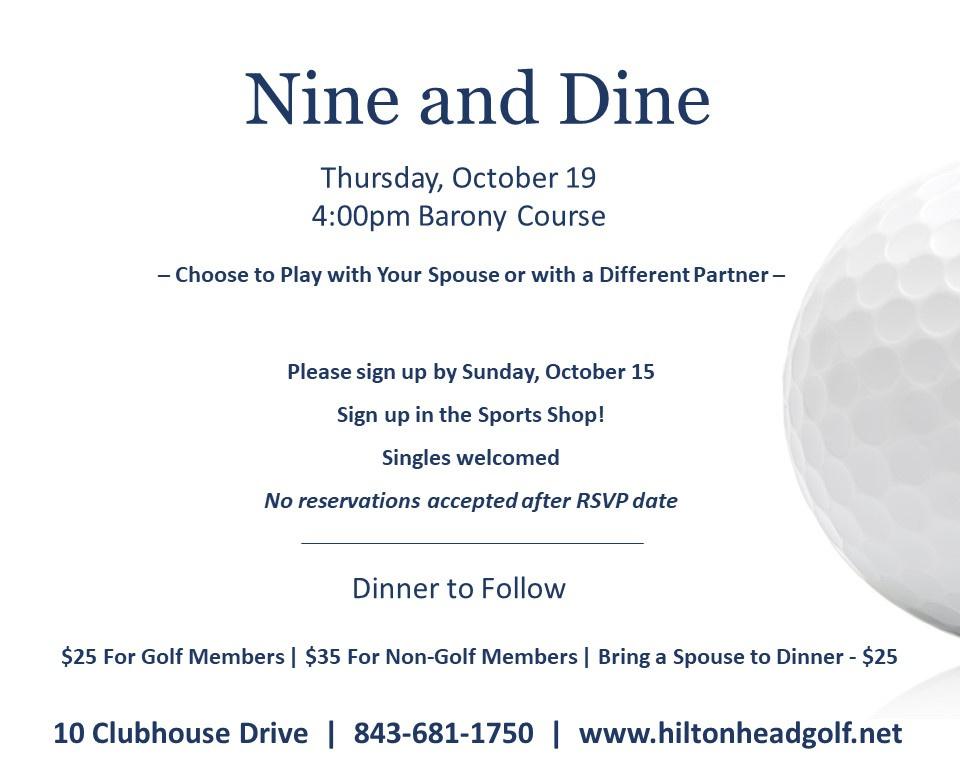 Join us on Thursday afternoon October 19 for NINE AND DINE After 9 holes of golf join us in the member's dining room for dinner. Everything’s included in the fee golf, golf cart, and buffet dinner Sign up for this event in our pro shop