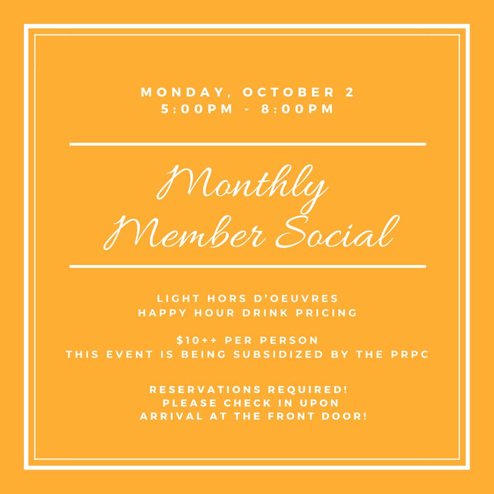 Monthly Member Social on Monday evening October 2 This event is always popular and at $10 per person, is a wonderful deal.