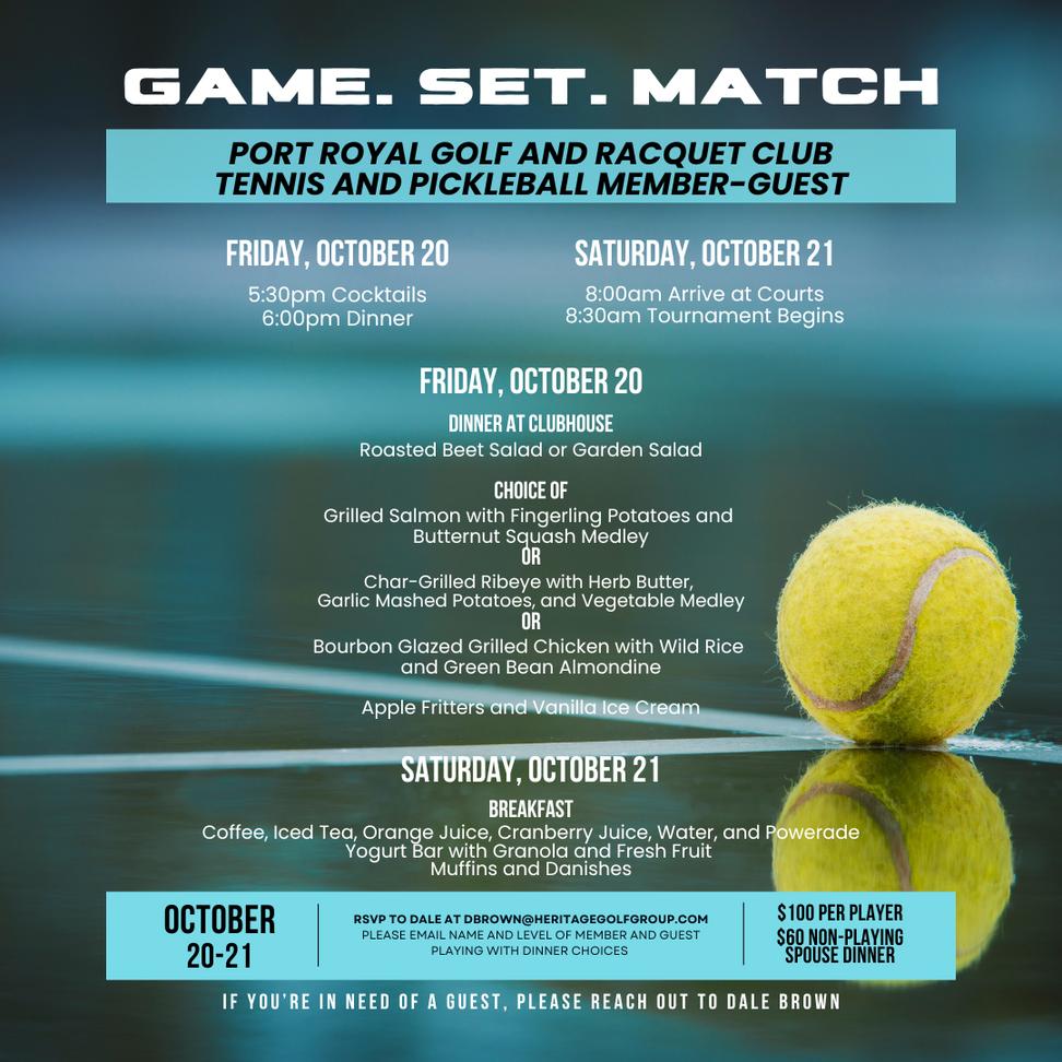 The dates are October 20-21. Our program includes a sit down dinner on Friday evening the 20th and a courtside continental breakfast and tournament play on Saturday morning. We have a great dinner with cocktails planned for Friday the 20th see the menu below. Our courtside buffet breakfast includes a yogurt bar, fresh fruits, granola muffins, and Danish with coffee, iced tea, OJ, cranberry juice, water, and Powerade.