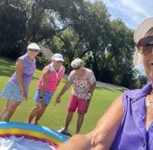 The tournament was an 18-hole scramble format with challenges and obstacles on several holes On Hole 1 players had to putt through a forest of HOT summer signs and plastic flamingos. On Hole 4 players were required to hit into a plastic swimming pool placed in front of the green before they could chip onto the green and putt out On Hole 10 players hit a water balloon with their driver off the tee resulting in a welcome explosion of cold water on a HOT day before hitting their real drives. On Hole 14 each player teed off while wearing a snake-shaped inner tube On Hole 17 players putted through a maze of stress balls distributed around the green. Each team was also given a "special" ball which was to be played by different players on every hole If the team kept the ball for the whole round and turned it in at the end of the round, they received extra points Oh – and players were required to take photos of their teams at the various challenges earning extra points and providing us with these wonderful action shots for this article! Following the tournament, the ladies enjoyed a lunch of HOT dogs, HOT French fries, and yummy brownies prepared by Jim Henington and his staff while receiving prizes chosen by Rhonda including neck coolers, fans, ice rollers, and more cool prizes for a HOT day