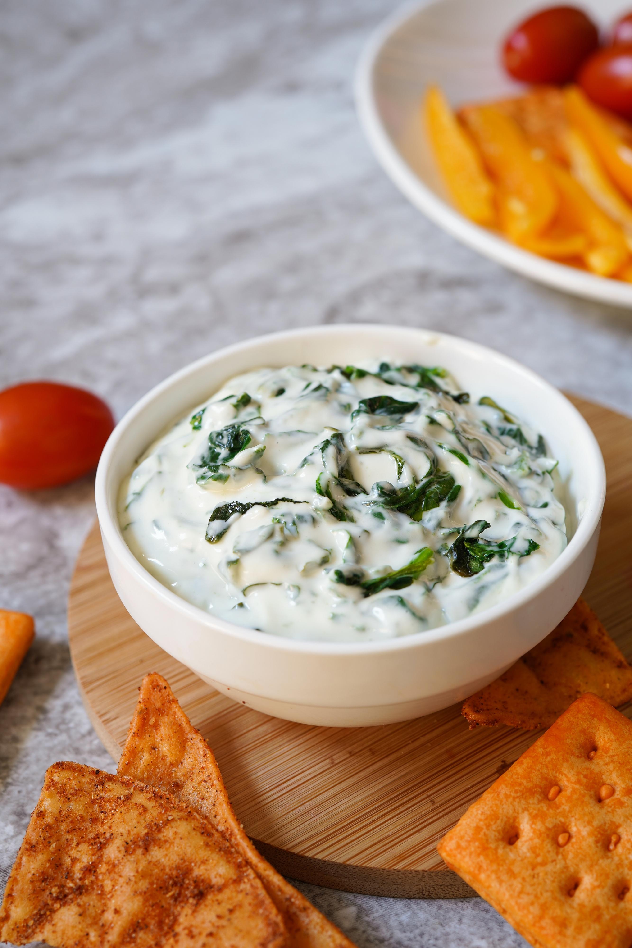 2 Put the cream cheese, sour cream, mayonnaise and garlic in a large bowl Mix vigorously until combined and smooth (If you prefer, you can use a stand mixer fitted with the paddle attachment ) Add the spinach to the cream cheese mixture, breaking it up as you add it Add the artichokes, mozzarella and 1/2 cup of the Parmesan, mixing to combine Season with salt and pepper Transfer the mixture to the prepared baking dish and top with the remaining 1/4 cup Parmesan