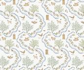 Taken from an authentic archival toile document, iconic Highgrove features have been added to this design, including yew tree hedges, pots, the Oak Summer House, a topiarised English yew, King Charles III’s bust, and the circular stone seat made of Derbyshire gritstone by masons from Hereford Cathedral, which the Bannermans designed. Each detail has been meticulously drawn and painted to master the handwriting and composition, seamlessly blending old and new.
