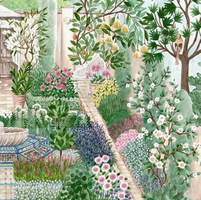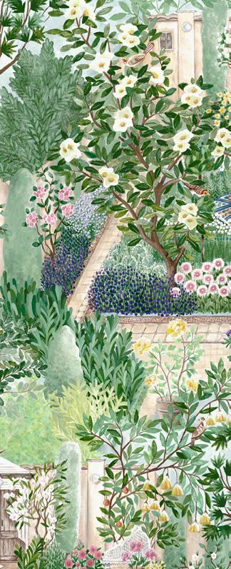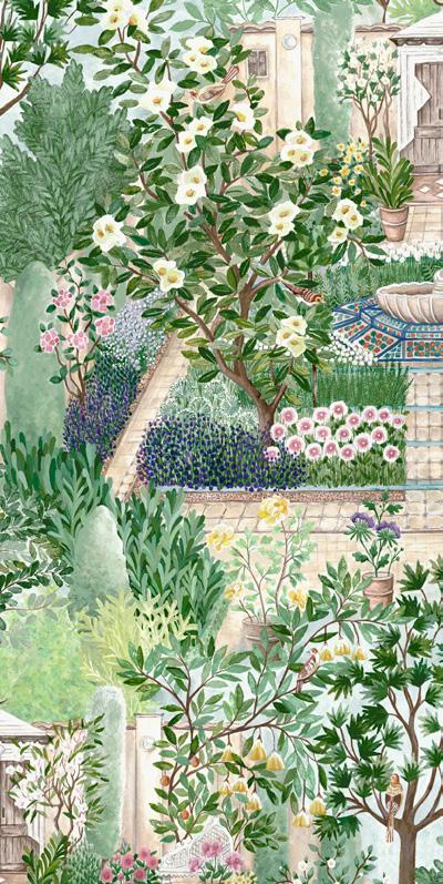 The Carpet Garden is a luscious walled garden inspired by an original sketch by King Charles III and based on a Turkish carpet at Highgrove. The sketch’s geometric shapes and colours translates into a vibrant living garden at Highgrove, which received the Silver Gilt Medal at the RHS Chelsea Flower Show. The Carpet Garden wallpaper mural encapsulates Highgrove’s global spirit and the magnificent Carpet Garden for which it is named (sometimes called Paradise Garden). Depicting Moroccan tiles, lime-washed pots, and abundant florals amongst citrus and olive trees and Italian cypress, the mural is a realistic interpretation of this wondrous garden. Mature cork oak trees, Indian chairs, and Moorish lanterns scattered throughout also feature.
