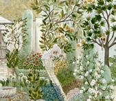 Reimagining Highgrove Gardens from a bird’s-eye or window view, this garden plan design focuses on the striking topiary yew hedge, Thyme Walk, and Kitchen Garden. These decorative, stylised elements create a whimsical fabric featured in an ornamental display of Highgrove’s finest shrubs and hedges.