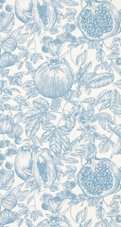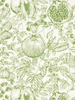 A contemporary interpretation of fruits found along the Silk Road, pomegranates, figs and lichees mingle in this modern toile wallpaper, hand drawn in pen.