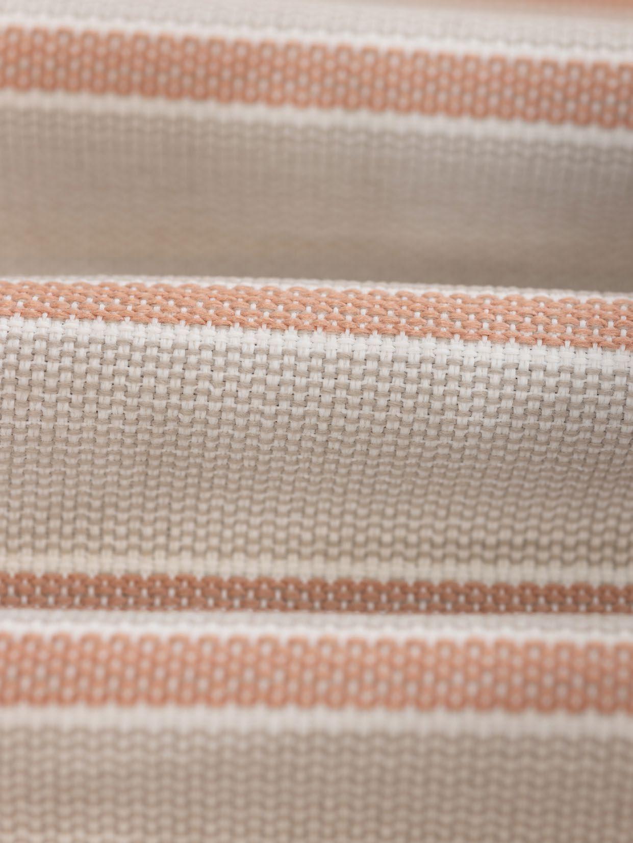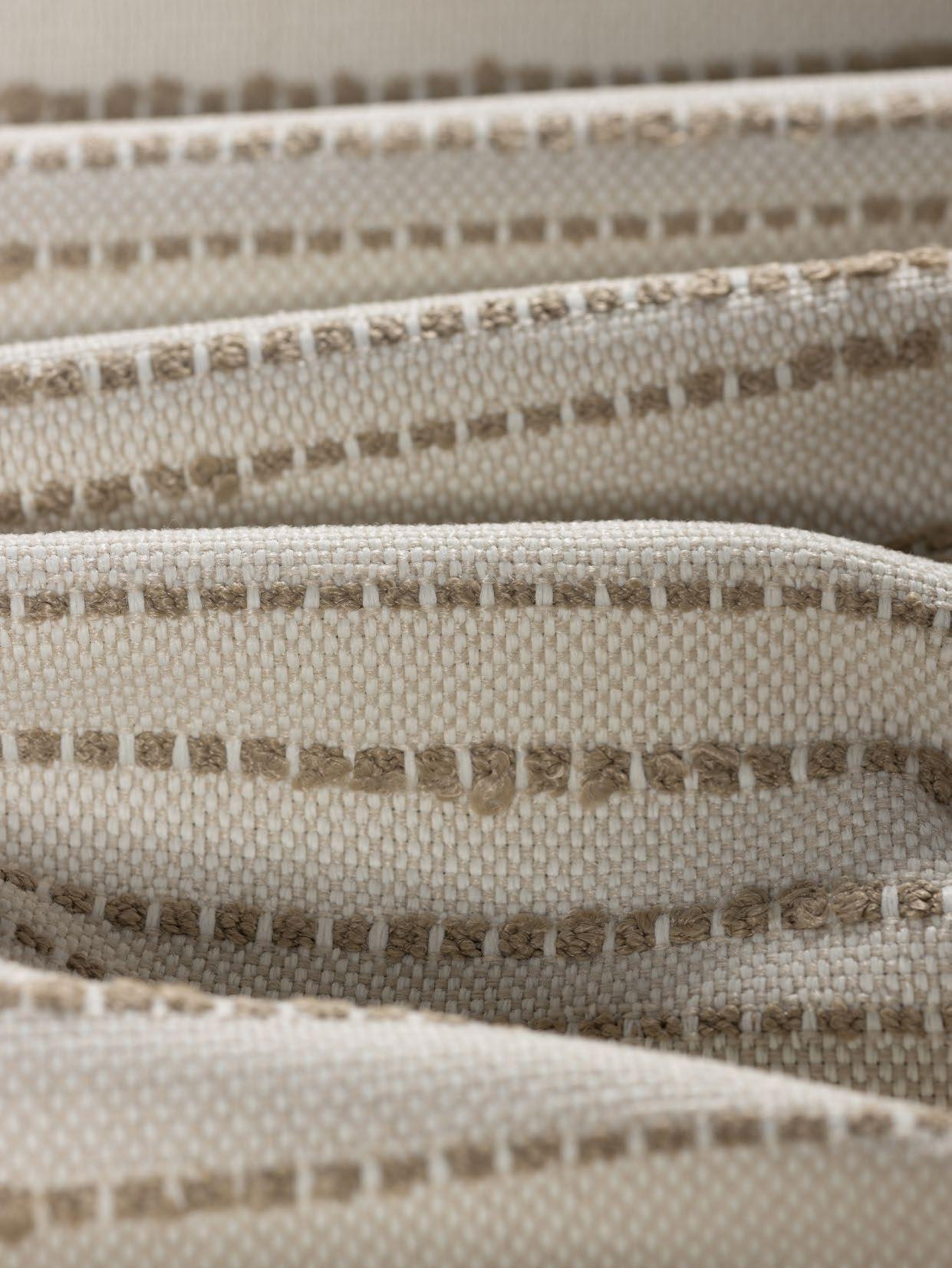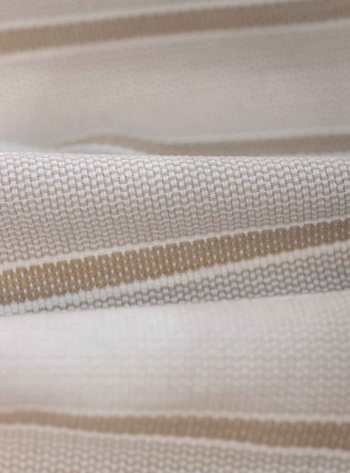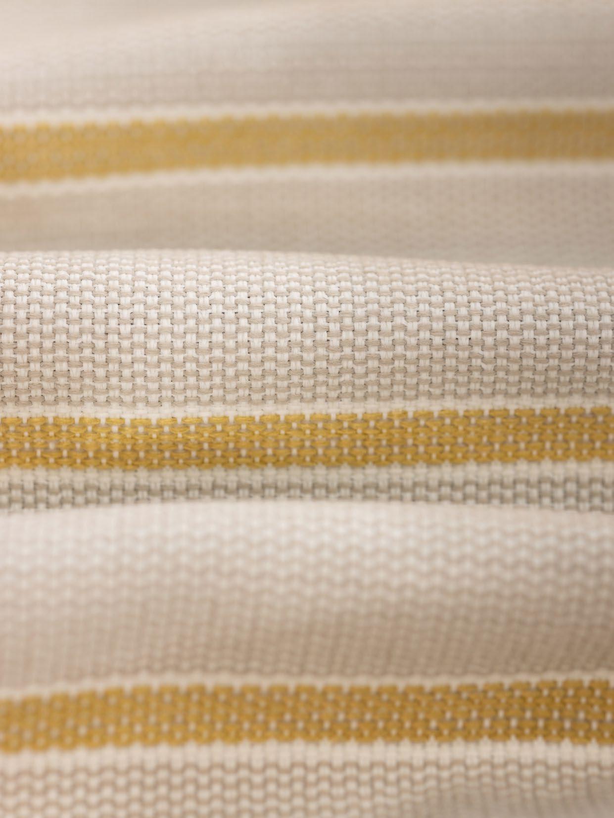140cm. 97% recycled olefin, 3% polyester. 20 000 rubs. Lightfastness: 7–8. Full outdoor and indoor use. Stain-resistant finish. Suitable for decorative upholstery. Use railroaded. Stripes run from selvedge to selvedge. This artisanal stripe features slight imperfections. Global recycled standard. Dye-lot variations may occur.