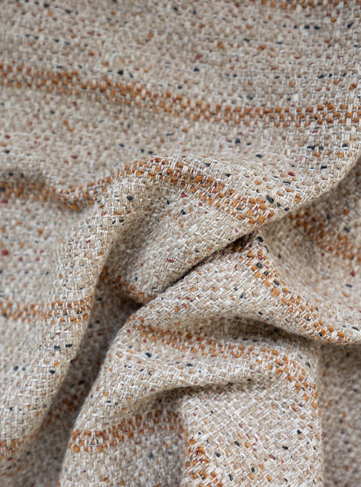 140cm. 32% polyester, 31% acrylic, 28% viscose, 8% linen, 1% polyamide. Exceeds 40 000 rubs. Down-the-roll pattern. Dye-lot variations may occur.