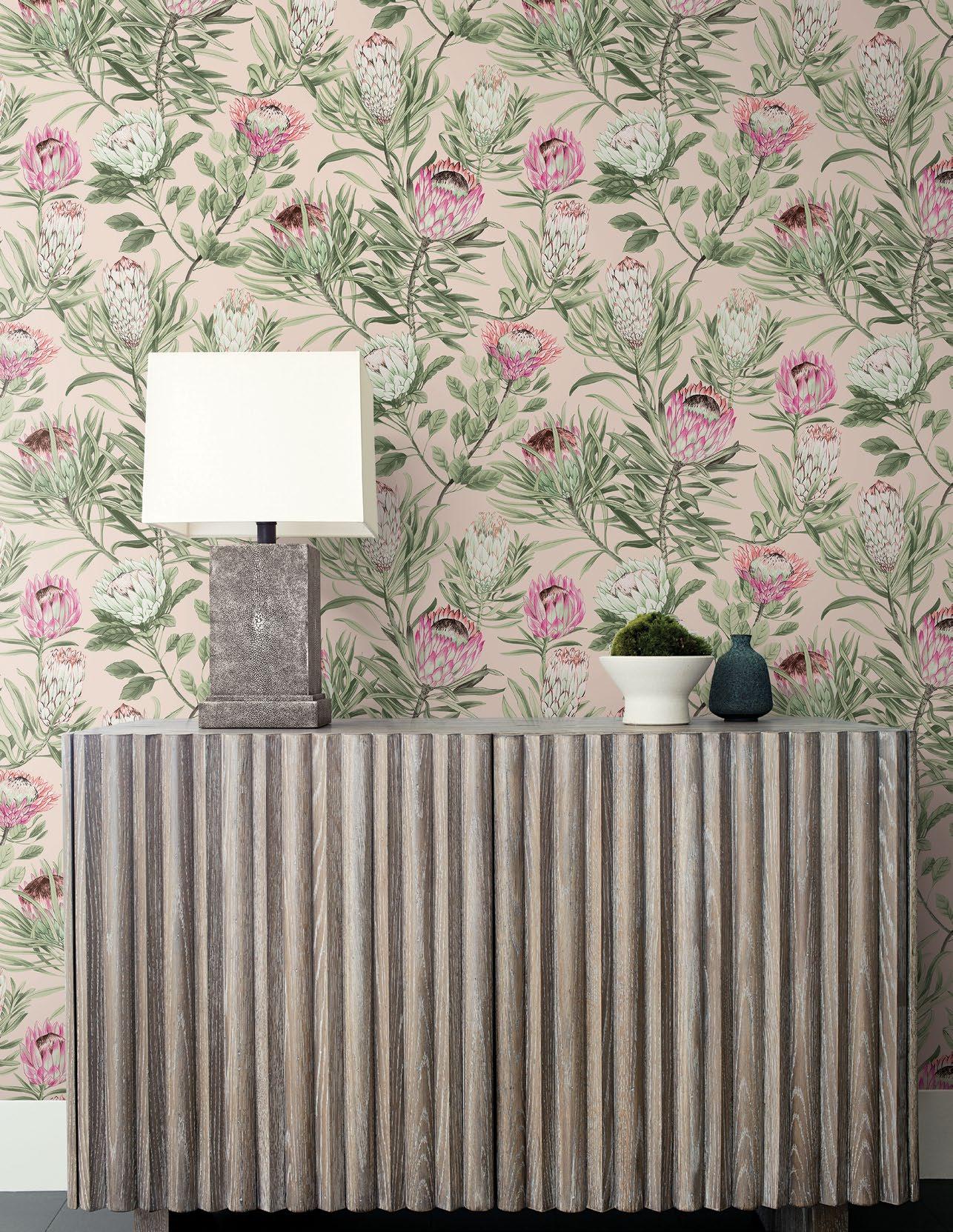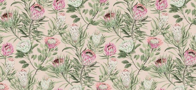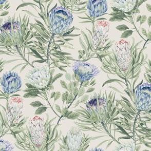 Gorgeous sugarbush blooms unfurl amongst rounded and spikey leaves in pattern Protea.