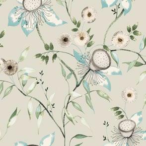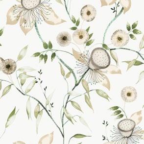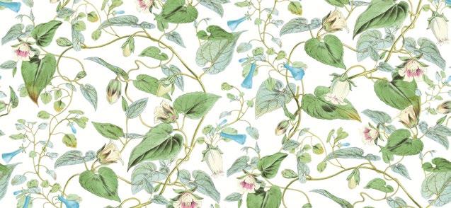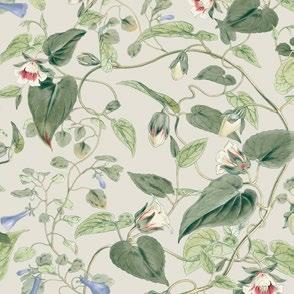 Delicate buds are in the midst of unfurling along verdant, leafy vines in pattern Moon Flower.