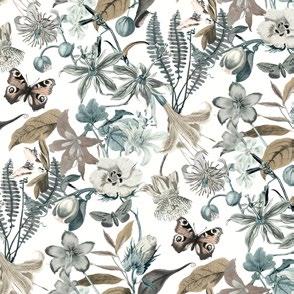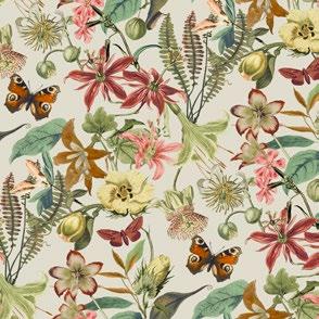 A garden of exotic blooms is visited by drifting butterflies in pattern Butterfly House.
