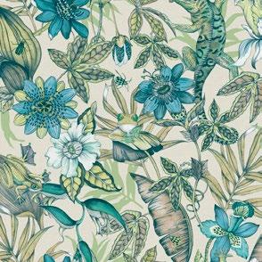 The smaller denizens of the tropics climb amidst lush flowers and foliage in pattern Rainforest.