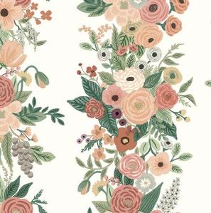 Our signature Garden Party florals, here presented in an organic, vertical stripe that is classic and feminine. RP3713 RP3714 RP3711 RP3712 RP7310 Shown On Opposite Page Repeat 20.5 in (52,07 cm) Roll Width 27 in (68,58 cm) Roll Length 27 ft (8,22 m) Heavyweight Paper Price Code B ©2022 Rifle, Inc. All Rights Reserved.