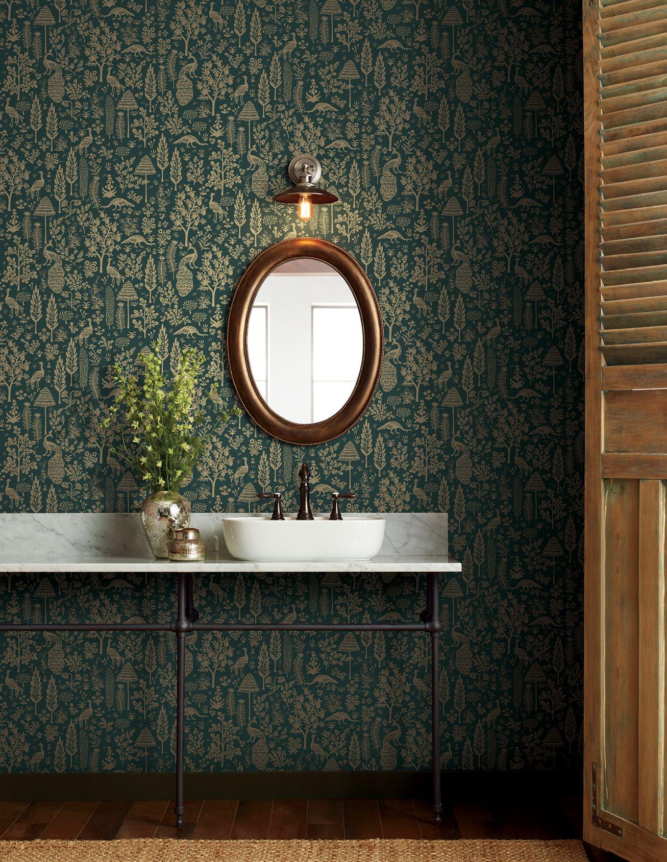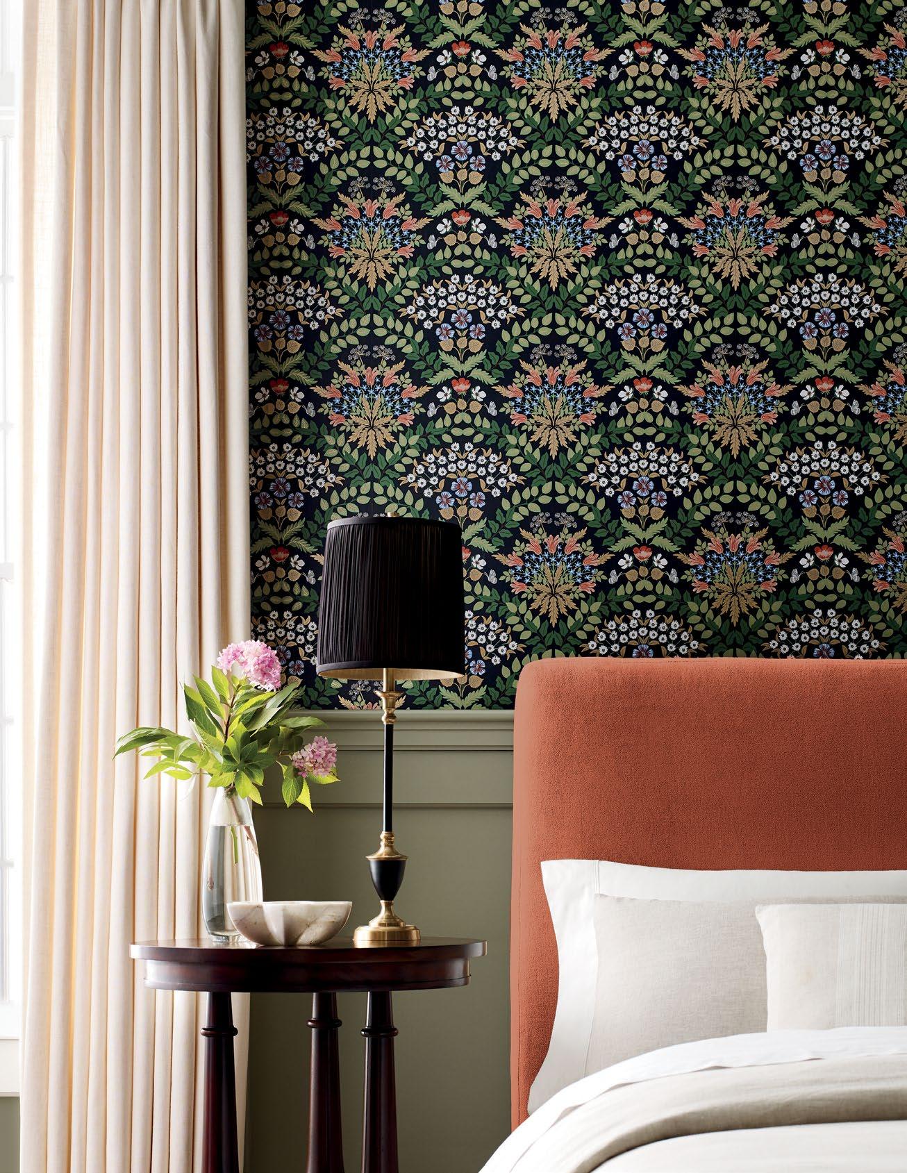 Drawing inspiration from French palace gardens, Luxembourg features mirrored medallions of florals, greenery, and the occasional bird to create a pattern that is sophisticated and timeless.