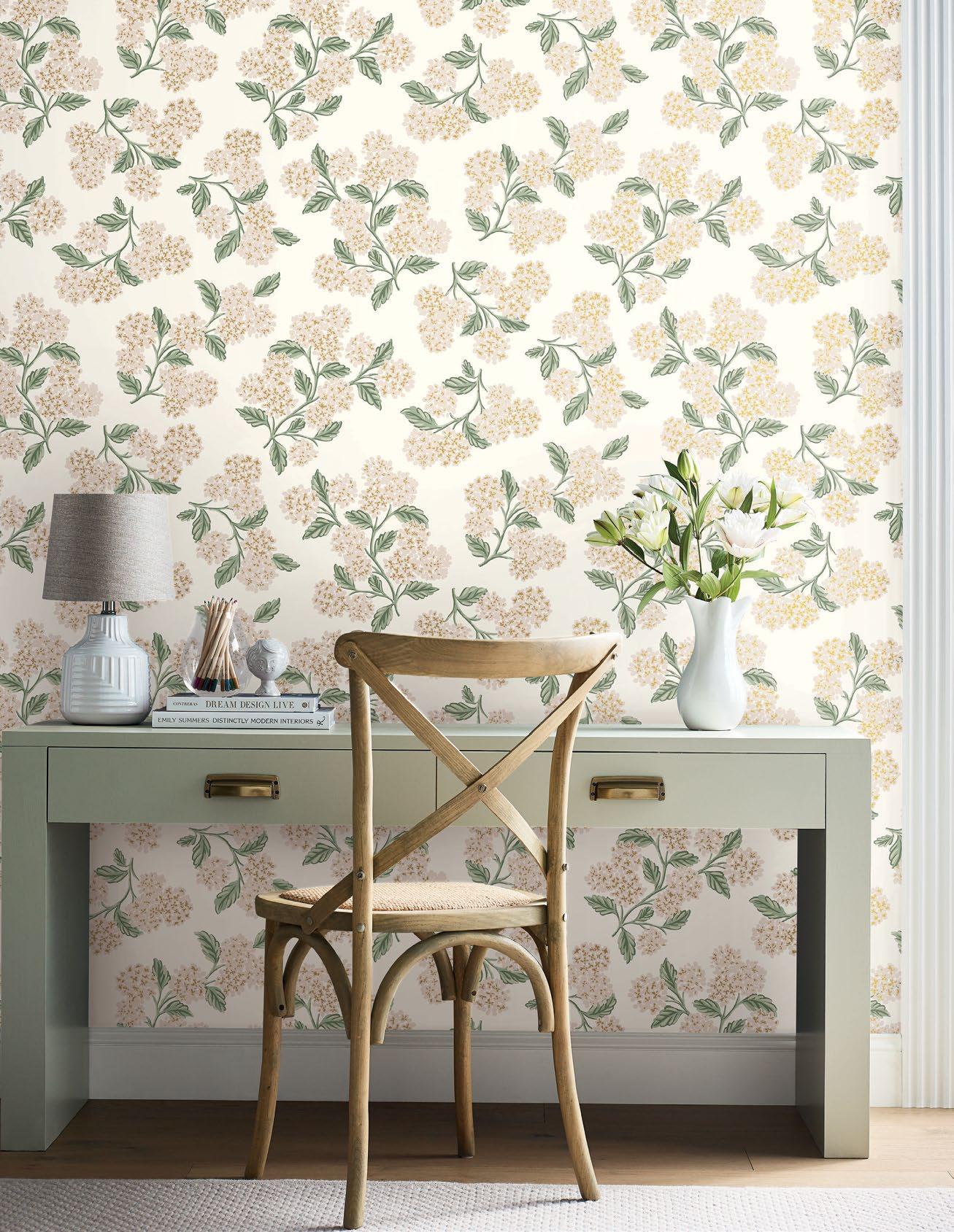 Our Hydrangea wallpaper is both elegant and elevated, with abundant branches blooming with the classic flower. RP7394 - Metallic Accent RP7395 - Metallic Accent RP7393 - Shown On Opposite Page - Metallic Accent Repeat 25.25 in (64,13 cm) Roll Width 27 in (68,58 cm) Roll Length 27 ft (8,22 m) Non-Woven Price Code B ©2022 Rifle, Inc. All Rights Reserved.