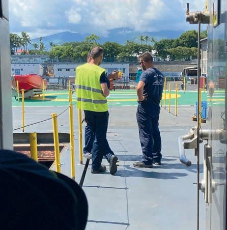 Commence ensuite la visite du navire. En contrebas, on peut apercevoir la plateforme dédiée à l’hélicoptère et les zones de stockage des conteneurs. Au total, l’Astrolabe peut transporter 36 conteneurs (20 sur la plateforme et 16 en cale).