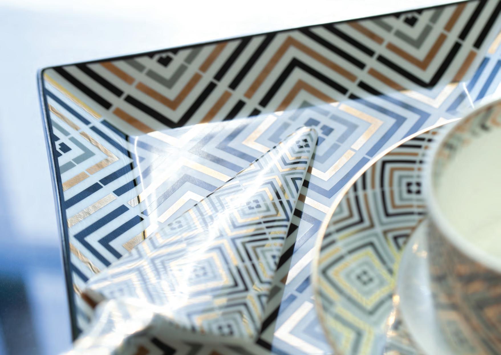 Risveglio con brio o pausa rigenerante? Caratterizzata da una decorazione che sprigiona energia, la nuova linea VLK Design è destinata a diventare protagonista in tavola. Motivi geometrici in bianco e nero si intrecciano con l’oro zecchino, su pregiata porcellana New Bone China. Novità e tradizione in una linea dinamica e sofisticata, espressione di uno stile moderno e dal sapore vintage al tempo stesso.