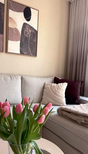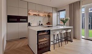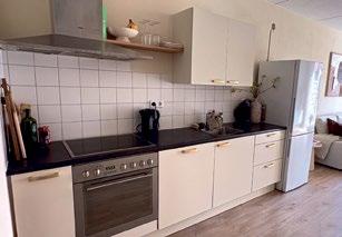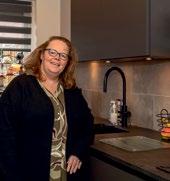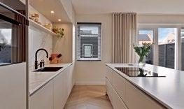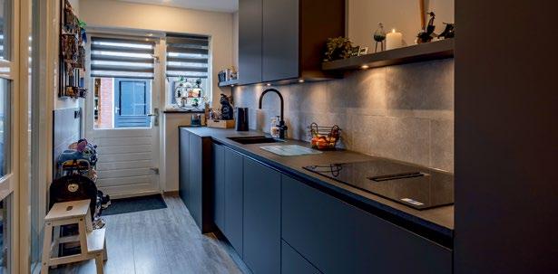 woonkamer en keuken. De keuken aan de voorzijde heeft Sarah omgetoverd tot een stijlvolle zandkleurige keuken met gouden deurhendels. Alleen het zwarte aanrechtblad herinnert nog aan de keuzes van de vorige bewoners; dat wordt op termijn vervangen door een betonlookblad. Het keukenblok is volledig ingericht, maar eerlijk is eerlijk: koken gebeurt hier niet veel. Met een vader die kok was, is het blokje om naar het ouderlijke huis wel erg verleidelijk. Overigens, wie zei er niet koken?