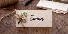 Knip kaartjes van stevig papier, schrijf namen met een zwarte pen en leg er een takje rozemarijn of een klein bloemetje bij.