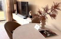 Wat een fijne plek om te ontspannen! In de woonkamer staat verder een mooie ronde eettafel van beton met rondom vier suède stoelen in de kleuren grijs en goud. Er is een hangmeubel, waarop ook de televisie staat. De boeken die er staan, zijn puur voor de sier.