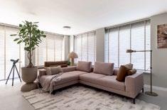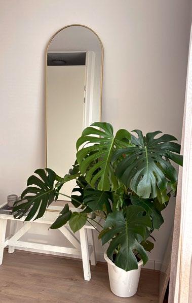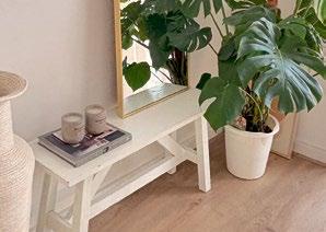 met Japandi en Mediterrane accenten. Je voelt direct de rust, precies wat je wilt na een drukke werkdag. Direct in het oog springt ook de vloer van de benedenverdieping: laminaat in een kokosachtige tint – niet wit, niet geel, maar subtiel er tussenin. Perfect passend bij de rest van het interieur. In de gang staat onder andere een leuk houten bankje met een spiegel erboven en natuurlijk een praktische kapstok.