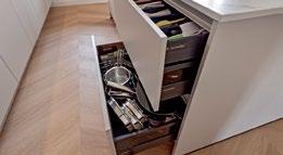 Sandra: “In onze oude keuken hadden we wel vijf bovenkasten, maar dat wilden we echt niet meer, hoogstens twee voor glas en voor servies. De lades onder het werkblad hielpen om het verlies aan opbergruimte te compenseren. We kozen een apothekerskast voor kruiden, chips en dergelijke. We hebben een heel fijn model gevonden, waarbij je la voor la kunt uittrekken.