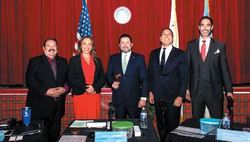 TAKING THE GAVEL: (l-r) Councilmember John R. Garcia, newly appointed Mayor Pro Tem Dr. Monica Sanchez and Mayor Gustavo Camacho, and Councilmembers Andrew C. Lara and Erik Lutz.